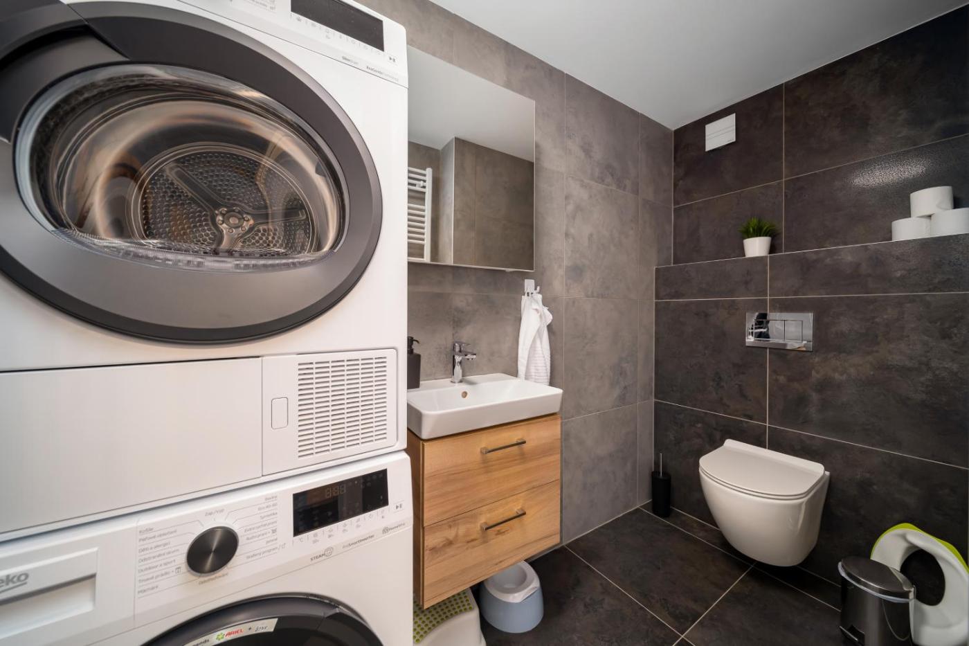 Two-Bedroom Apartment with Balcony. This spacious apartment comes with 1 living room, 2 separate bedrooms and 2 bathrooms with a shower and a hairdryer. The well-fitted kitchen has a stovetop, a refrigerator, a dishwasher and kitchenware. Boasting a balcony with garden views, this apartment also features a washing machine and a flat-screen TV with streaming services. The unit has 6 beds. ;
