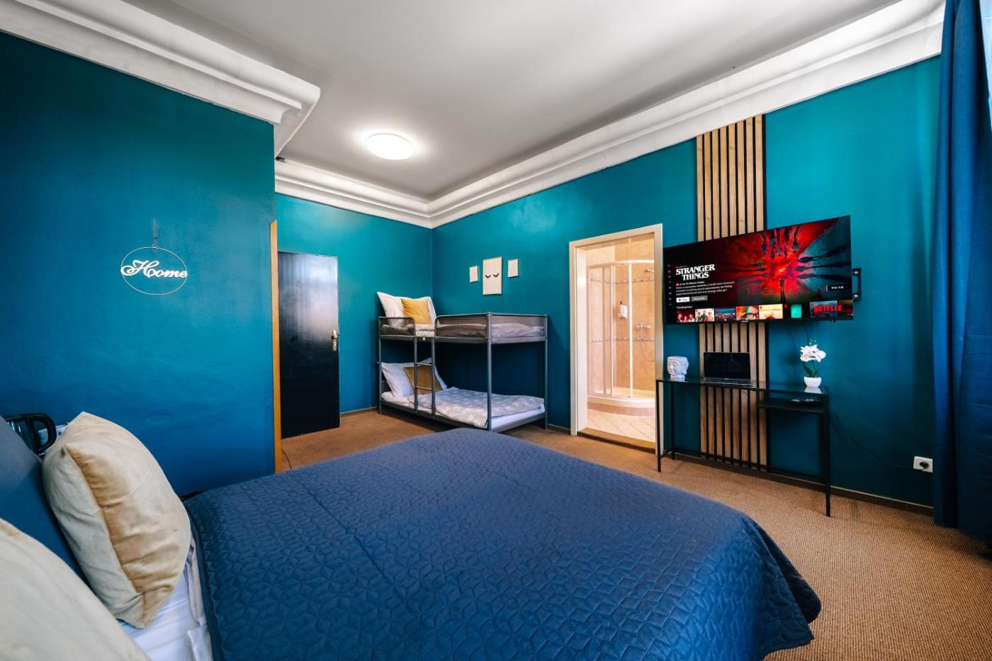 Quadruple Room with Shower. Providing free toiletries, this quadruple room includes a private bathroom with a shower and a hairdryer. The quadruple room provides a seating area, an electric kettle, a carpeted floor, heating, as well as a flat-screen TV with streaming services. The unit offers 3 beds. ;